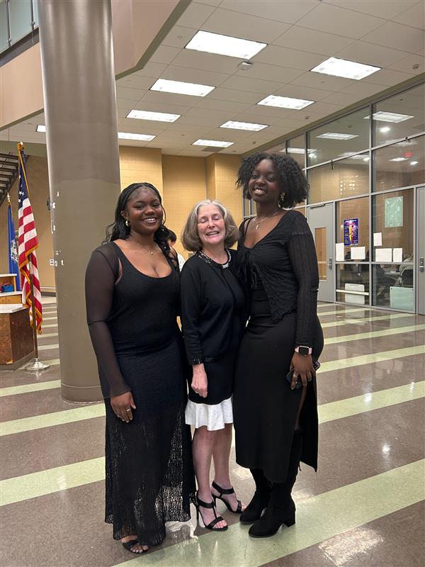 Seniors Zhariya and Lumi pose with Ms. Liscov outside The Black Box during the Winter Dance.